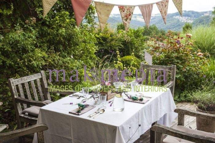 Terrace with set table and chairs, bunting decorated with lavender and other flowers - Lavender summer party story