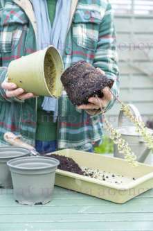 Woman removing Pelargonium cuttings from pot, exposing the roots