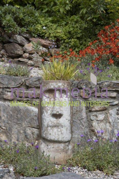 Easter Island style sculptural head planted with an ornamental grass to add interest to terracing. Spring