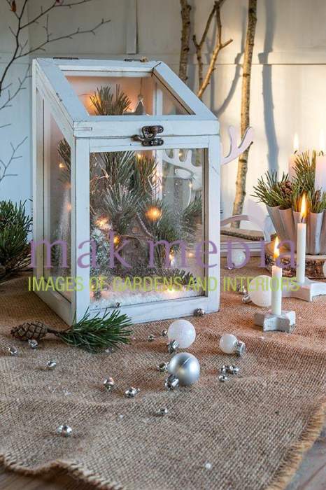 Festive arrangement using pine foliage and cones, LED lights, candles and baubles in rustic setting.