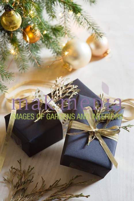 Christmas presents tied with gold ribbons and decorated with painted foliage