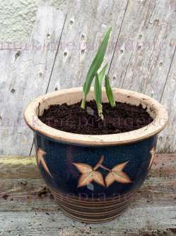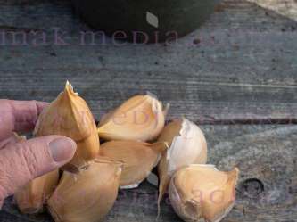 Person holding large cloves of Elephant Garlic ready to be planted in pot.