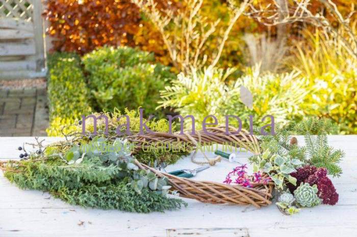 Wreath, snips, wire, plants and moss laid out on a wooden surface