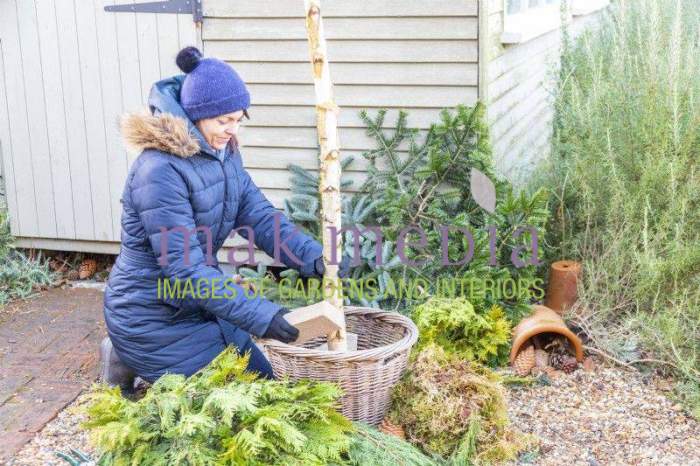 Woman placing bricks around the birch trunk in the basket to hold it in place