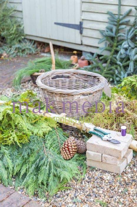 Bricks, secateurs, wire, moss, conifer branches, basket and a large birch stick laid out on the ground