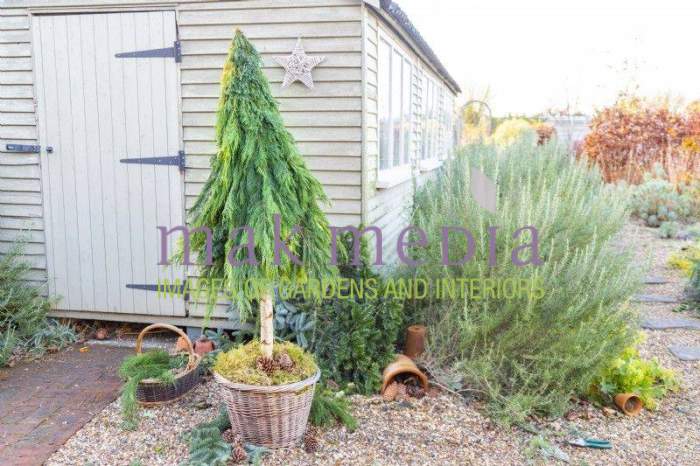 Foraged Christmas tree next to garden shed