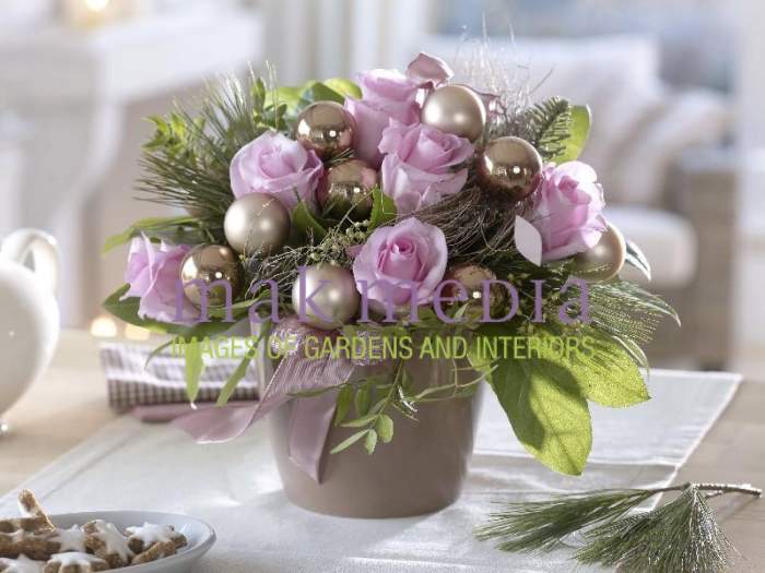 0041383 Weihnachtsstrauß aus Rosa ( Rosen ), Pinus ( Kiefer ), Eukalyptus Weihnachtsstrauß aus Rosa ( Rosen ), Pinus ( Kiefer ), Eukalyptus , Salal-Blättern, Pistacia ( Pistaziengrün ), Euphorbia spinosa ( Strauchwolfsmilch ) und ChristbaumkugelnPokaż całość